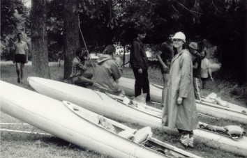Do zadań wymagających zdecydowania, trafności oceny i wyczucia taktycznego należało zawsze wyszukiwanie miejsca na biwak. Postoje na tłocznych namiotowiskach traktowane były jako ostateczność. Niekiedy jednak chęć skrywania się w zacisznym ustroniu sprowadzała na naszą głowę rozmaite służby interwencyjne. Najczęściej zjawiali się wczesnym rankiem panowie z leśnictwa, z którymi kierownik spływu bardziej lub mniej skutecznie pertraktował co do wysokości opłaty za rozbicie namiotów. PRAWIE nigdy nie zatrzymaliśmy się w rezerwatach (chyba że ich granice były trudne do ustalenia, albo naglił zbliżający się zmierzch - daty i miejsca przemilczmy). Na poligonie drawskim w roku 1991 odwiedził nas - sympatycznie uzbrojony - patrol wojskowy, sugerując, abyśmy zwinęli obóz najpóźniej do rana. Bywało jeszcze gorzej. Kiedyś w środku nocy pijany jegomość zabłądził samochodem na leśnych dróżkach i już, już wjeżdżał w uśpione namioty. Naprzeciw owego straceńca wyskoczył - naprawdę w ostatniej chwili! - wyrwany ze snu ówczesny szef spływu (A. Szaflarski) z namiotowym masztem w dłoni. Konfrontacja skończyła się w miarę uprzejmym objaśnieniem drogi...